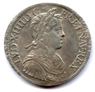 Buste lauré, drapé et cuirassé du roi enfant, avec la mèche longue. Couronne de laurier sans baies. Point sous le 4e I de XIIII. Etoile en remplacement du point après le G. R/. Écu de France couronné. Lettre d'atelier à la pointe de l'écu et millésime en fin de légende. Fleur à huit pétales en début de légende. Triangle sou le O de DOMINI.