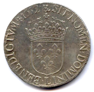 Buste lauré, drapé et cuirassé du roi enfant, avec la mèche longue. Couronne de laurier avec baies. Point: en début de légende, après G, devant FR et en fin de légende. R/. Écu de France couronné. Lettre d'atelier à la pointe de l'écu et millésime en fin de légende. Monogramme LB en début de légende et croix potencée devant la date.