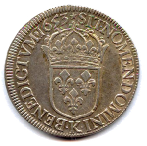 Buste lauré, drapé et cuirassé du roi enfant, avec la mèche longue. Couronne de laurier avec baies. Point initial. NA au lieu de NAV. R/. Écu de France couronné. Lettre d'atelier à la pointe de l'écu et millésime en fin de légende. Etoile en début de légende. Petit tête chauvedevant la date.