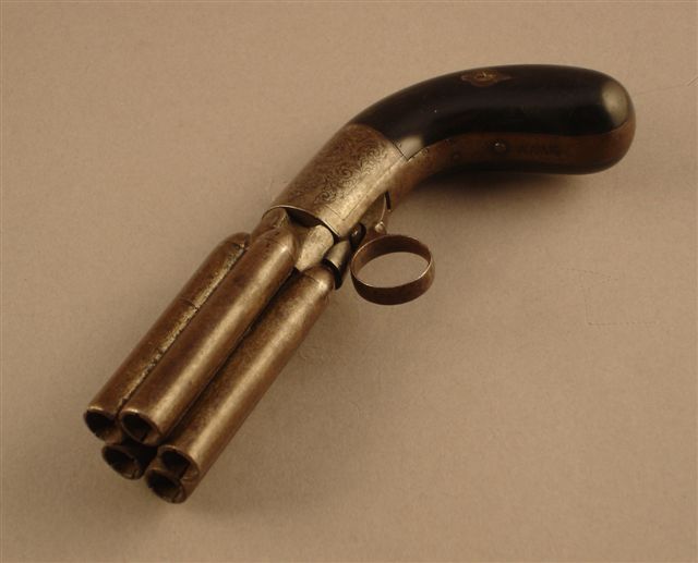 REVOLVER À PERCUSSION Mariette, 5 coups. Canons à balle forcée en damas. Carcasse arrondie gravée. Détente en anneau. Plaquettes de crosse en ébène. Vers 1850.