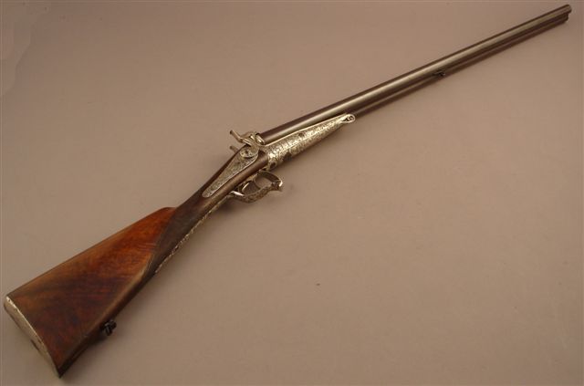 Fusil de chasse à broche système Lefaucheux, deux coups, calibre 12. Canons en table, damas, de couleur tabac, signés sur la bande « Martin à Chartres ». Platines arrières signées, chiens, bascule, pontet et garnitures joliment ciselés de rinceaux feuillagés et de masques de grotesque, finition poli glacé. Crosse en noyer en partie quadrillé .