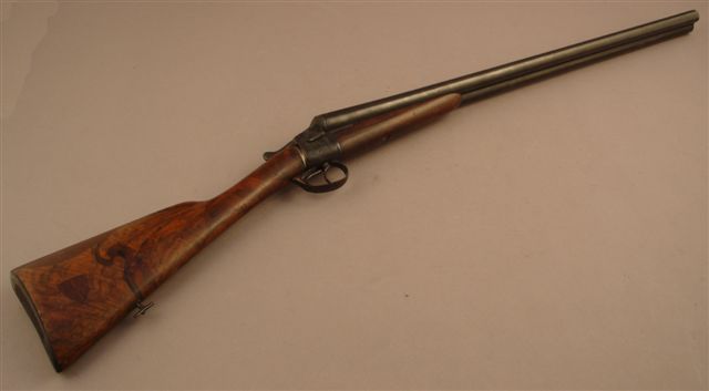 Fusil de chasse Darne à bloc pivotant, deux coups, calibre 12-65. Canons juxtaposés de 65,4 cm. Bloc de culasse jaspé, gravé de feuillages. Ouverture par clé sur le côté droit. Crosse en noyer de 35,5 cm (réparation).