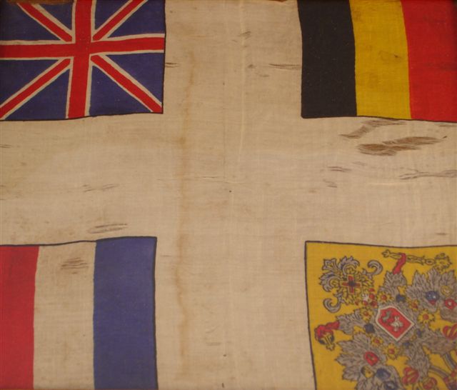 POCHETTE EN SOIE souvenir de la guerre 1914/1918. Sur un fond blanc, elle présente à ses quatre angles les drapeaux de l'Angleterre, la Belgique, la Russie et le France.