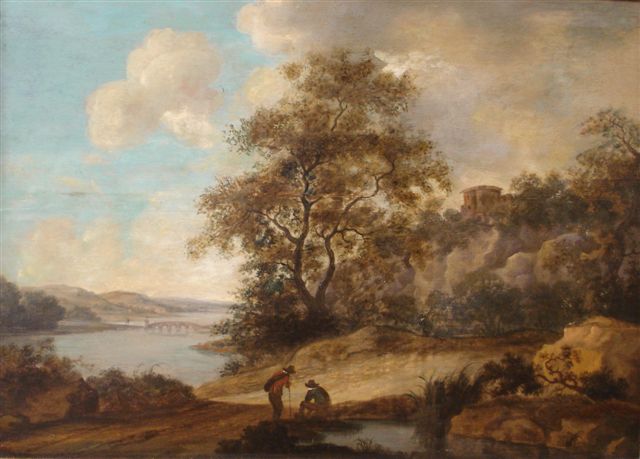 École FLAMANDE du XVIIIème siècle. Paysage de rivière et voyageurs....