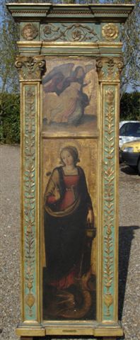 Deux pilastres corinthiens, constitués d'encadrements ornés de pots fleuris en léger relief, soutiennent un entablement sculpté de rinceaux et flanqué de deux rosaces. L'ensemble est surmonté d'une corniche ornée d'une frise de perles.