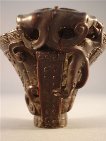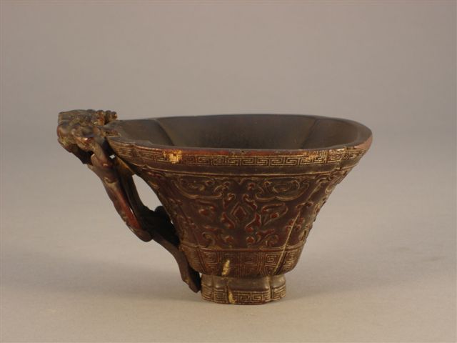 COUPE LIBATOIRE en corne de rhinocéros à décor sculpté en léger relief de masques de taotie et rinceaux, l'anse ajourée en forme de qilong animal mythologique, le bord et le pied ornés de frises de grecques. Petits éclats.