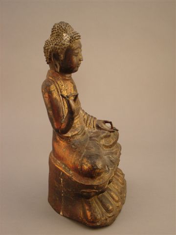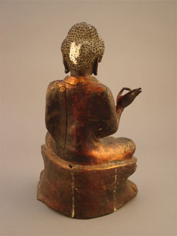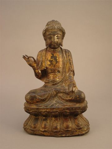 STATUETTE de bouddha en bronze laqué or assis en padmasana sur le double lotus, les mains en vitarka mudra (geste de l'argumentation).