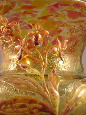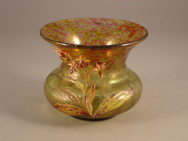 Vase ovoïde aplati sur talon à col évasé. Épreuve de tirage industriel réalisée en verre fumé transparent. Décor d'ophrys gravé à l'acide, émaillé à chaud à rehauts d'or.