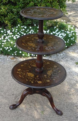 SERVITEUR MUET en acajou et marqueterie de bois clair. Composé de trois plateaux circulaires, marquetés dans des cartouches de filets de bois clair de rinceaux fleuris, de feuilles d'acanthe affrontées. Fût central de forme balustre, reposant sur trois pieds galbés marquetés de fleurs. (manques).