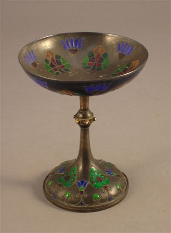 COUPE en métal argenté émaillé à décor d'émaux ajourés. Cette coupe repose sur un piédouche émaillé de motifs végétaux stylisés. Le fût est orné d'un bulbe agrémenté de six petites perles montées en cabochons.