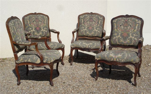SUITE de quatre FAUTEUILS à la reine en bois naturel mouluré et sculpté. Dossiers droits de forme chantournée, surmontés de fleurettes. Accotoirs à manchettes terminés en enroulement, supports d'accotoirs en coup de fouet. Ceintures chantournées, centrées de fleurettes en façade. Pieds cambrés et feuillagés.