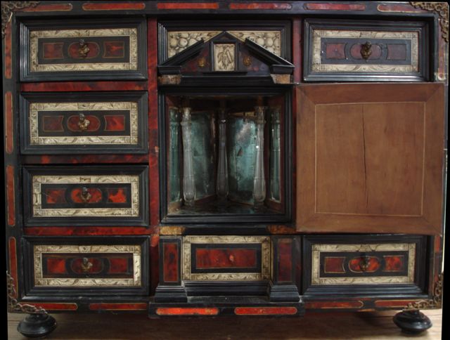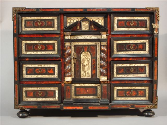 CABINET de forme rectangulaire en placage d'ébène, os, écaille et bois noirci. Il ouvre à neuf tiroirs sur quatre rangs et un vantail au centre. Les tiroirs sont constitués d'un encadrement d'ébène mouluré contenant une frise de plaque d'os formant un cartouche plaqué d'ébène contenant trois plaques d'écaille. La façade est composée de trois travées. La partie centrale, en léger ressaut, figure un portique dont la base occupe le premier rang de tiroirs. Le portique est constitué de deux colonnes salomoniques engagées d'écaille, entourant une plaque d'os sur laquelle est représenté un personnage en armure. L'entablement atteint le troisième rang de tiroirs. Le fronton brisé est contenu dans le tiroir central du quatrième rang. Il est centré d'une plaque figurant un personnage en tenue du XVIIème. Le vantail découvre un théâtre orné de miroirs et agrémenté de trois colonnes de verre (cristal?) taillé. Il se retire pour accéder à trois tiroirs secrets. L'ensemble repose sur quatre sphères aplaties. Ornements de bronze tels que: filets, entrée de serrure, prises en buste de femme et renforts aux angles. (accidents, manques).