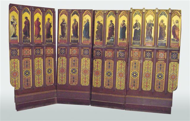 BOISERIES dans des encadrements en chêne panneauté - à décor de motifs de rosaces et d'entrelacs polychrome dans la partie inférieure - et ensemble dans la partie supérieure de quatorze personnages peints fond or, sur toile représentant le Christ, la Vierge et les douze apôtres.