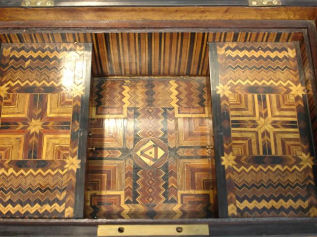 COFFRE en marqueterie de bois exotique, polychrome de forme rectangulaire. La façade, les flancs et la partie supérieure, ornée des lettres en bronze " APIDF " et " NELJJ ", sont marquetés de motifs de chevrons en recouvrant l'entière surface. Chaque côté est centré d'un carré déclinant de nouveaux motifs géométriques. Le plateau comporte au revers une glace contenue dans un encadrement marqueté alliant doucines et moulures. L'intérieur, entièrement marqueté, comporte quatre tiroirs répartis de chaque côté d'un espace laissé ouvert. (manques).