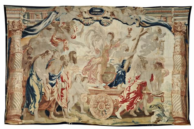 Sur un chariot ouvragé tiré par deux anges et poussé par des putti se dresse une jeune femme un calice à la main. Elle symbolise la Foi. À ses côtés, est agenouillé un ange portant une croix. Dans un cartouche en haut de la tapisserie, sont inscrits les mots FIDES CATHOLICA