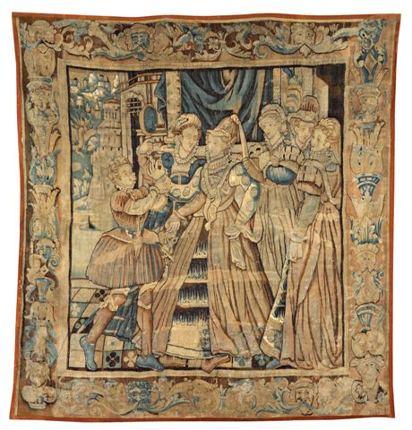 Tissée en laine et soie, la tapisserie présente des accidents, usures et plusieurs parties retissées.