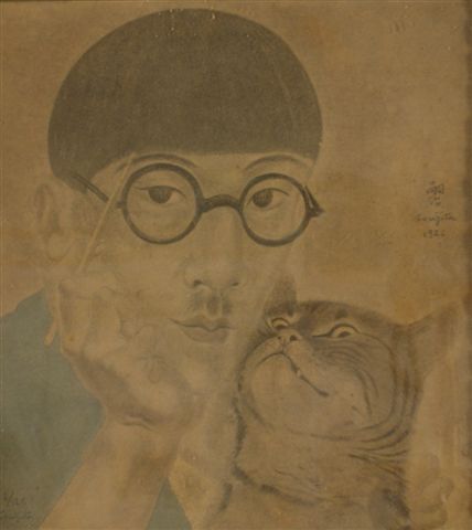 Léonard FOUJITA (1886-1959)Autoportrait au chat.Épreuve en couleurs, signée en français...