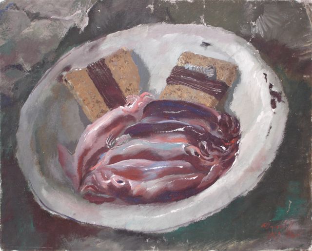 Alexandre IACOVLEFFNature morte aux calmars dans un plat. Toile, signée,...
