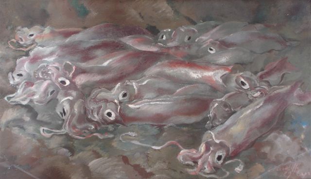 Alexandre IACOVLEFFNature morte aux calmars. Tempera sur toile, signée, datée...