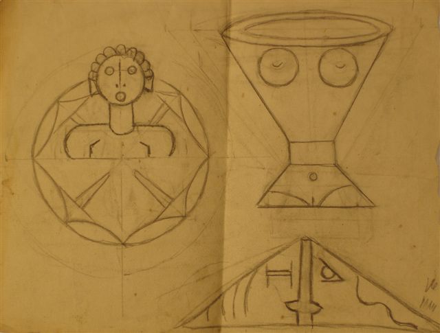 Esquisses d'objets anthropomorphiques. Crayon et rehauts mauves.