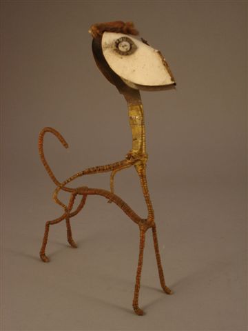 Figure en fil de fer, tôle, peau de chevreau, matière plastique et boutons.