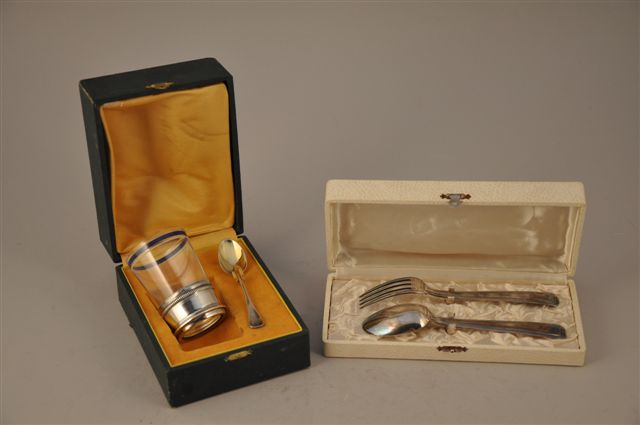 VERRE DE BAPTÊME. Monture en argent à moulures de filets et godrons. Avec sa cuillère en vermeil. Poinçon Minerve. Dans son coffret. XXème siècle.