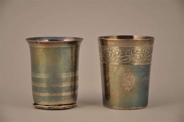 DEUX TIMBALES dite de baptême en argent. Décor d'un ruban de brins de muguets, et filets. Initiales entrelacées: "D G ". Poinçon Minerve, XXème.