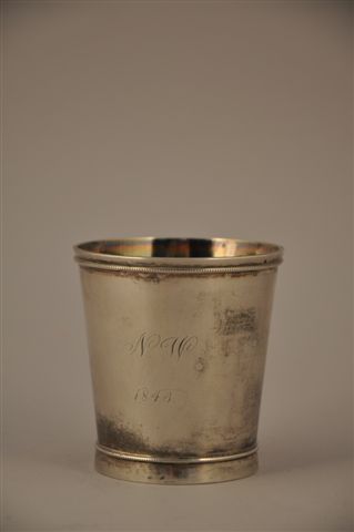 TIMBALE droite, de forme tronçonique dite de collégien. Initiales " N W " et datée "1843".