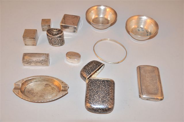 LOT en argent 800/1000ème composé de 5 BOITES à pilules: deux de forme cubique, une rectangulaire gravée, une ovale, une de forme carrée, PORTE CIGARETTES à décor plein de pampres de vigne façon damasquiné, Orfèvre E.G, DEUX TABATIERES, l'une à décor clouté, l'une plate monogrammée CM (accidents et réparations), un BRACELET rigide. deux COUPELLES évasées, frise de palmettes. Un CENDRIER ovale.