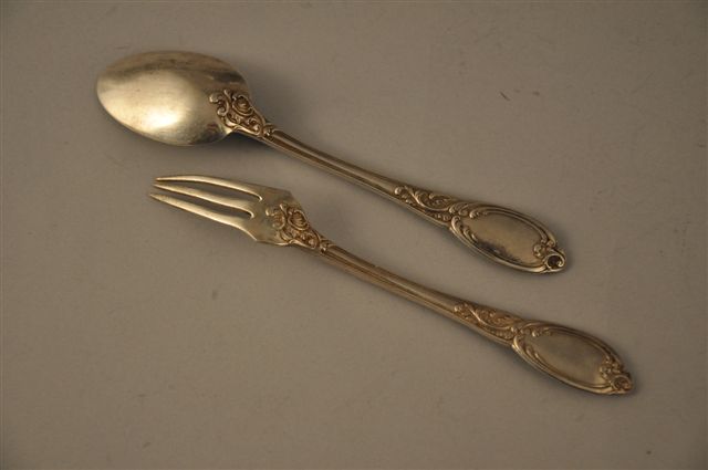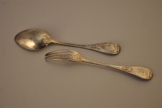 LOT comprenant un COUVERT À DESSERT en argent. Modèle filet. Décor de coquille et feuilles d'acanthe stylisées. Poinçon Minerve. Milieu du XIXème siècle. COUVERT À ENTREMETS en argent. Modèle filet. Décor de feuilles d'acanthe. Monogramme "LD". Poinçon Minerve.