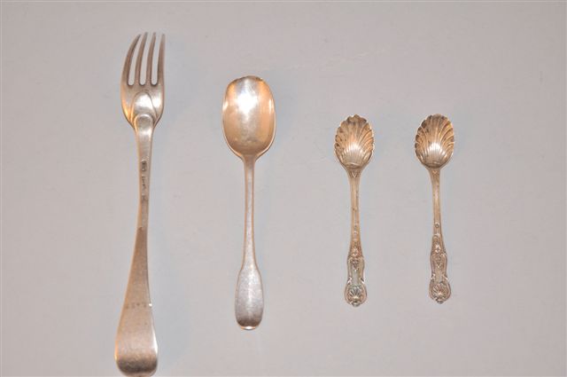 LOT en argent comprenant une FOURCHETTE modèle baguette ou Vieux Paris, Poinçons effacés XVIIIeme, une CUILLÈRE uni plat, poinçons effacés du XVIIIème, deux CUILLERES à CAFÉ de style Rocaille modèle coquille Poinçon Vieillard (1819-1838), orfèvre E.G, un PORTE SALERON de forme hexagonal décor de frise ajourée travail anglais.