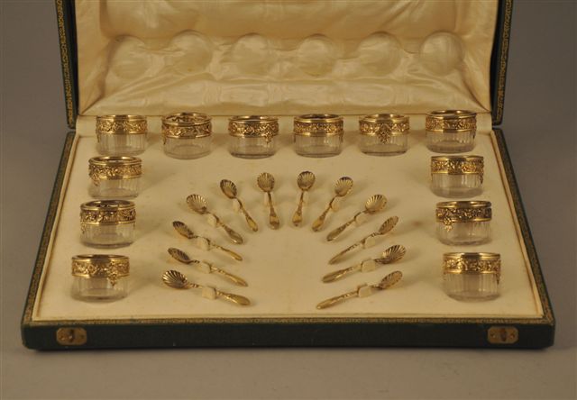 SERVICE À CAVIAR comprenant une suite de douze réceptacles cylindriques en cristal taillé à côtes, monture au col en argent doré, ajouré et ciselé de guirlandes de fleurs, et une suite de douze pelles en argent doré, le cuilleron coquille ovale, tige à filets et rubans croisés, ornée de fleurs nouées d'un ruban. Poinçon Minerve. Orfèvre: RISLER ET CARRE à Paris. Dans un coffret de la Maison.