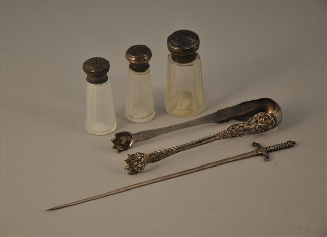 ENSEMBLE de TROIS SALIÈRES en verre. Joint une pince à sucre en argent (poinçon Minerve) et une épée coupe-papiers (poinçon Minerve).