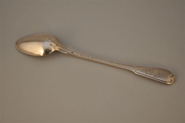 CUILLÈRE À RAGOÛT en argent. Modèle au filet. Porte le monogramme "DP" dans un cartouche rocaille. Reims, 1762-1768. Poinçon du maître-orfèvre Claude II LEMAIRE, reçu vers 1750.