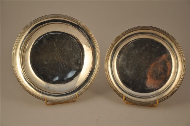 DEUX PLATS ronds en argent, à bordure godronnée. L'un poinçon Vieillard (1819-1838), l'autre poinçon Minerve de l'orfèvre VEYRAT.