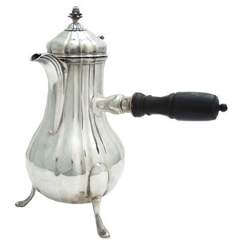 CHOCOLATIÈRE tripode en argent, corps à côtes, couvercle avec appui pouce surmonté d'une graine. Maître-Orfèvre: Michel Joseph HONOREZ, reçu Maitre en 1732. Lille, 1768.