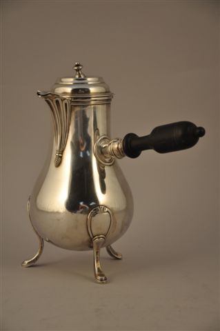 VERSEUSE en argent uni à moulures de filets, repose sur trois pieds à ressauts, les attaches en forme de spatule évasée godronnée, le bec sous une bague médiane, ciselé de cannaux et d'une pomme de pin, le couvercle à doucine et plan. Manche en bois tourné. Poinçon Minerve.
