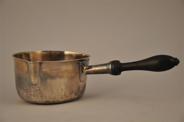 CASSEROLE en argent , bec verseur. Initiales couronnées " A L N A ". Manche bois tourné. Poinçon Minerve.
