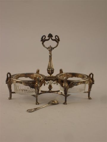 SALIÈRE DOUBLE en argent. Les salerons en verre blanc sont contenus dans deux montures cylindriques constituées d'une frise de palmettes, cygnes ailés se terminant par des pieds griffus. Élément de prise constitué de deux cygnes affrontés. Poinçon Minerve.