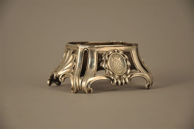 SALIÈRE en argent, de plan rectangulaire à pans. Le corps ajouré et mouvementé reposant sur volutes, présente deux larges coquilles et deux cartouches ovales dans un entourage de lauriers, l'un gravée d'armoiries couronnées. Paris, 1768. Maître Orfèvre: Jean-Pierre Chézelle, reçu Maître en 1745.
