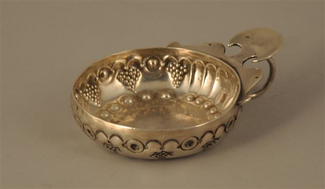 TASSE à VIN en argent, appui-pouce découpé avec anse, à décor de grappes de raisin et godrons. Gravé "Leroy, Vosne 1794". XIXème.