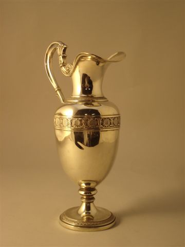 AIGUIÈRE en argent sur piédouche, à décor de palmettes stylisées, fleurs de lotus, et rangs de perles. Bec verseur élargi et anse à console renversée au motif de quatre feuilles.