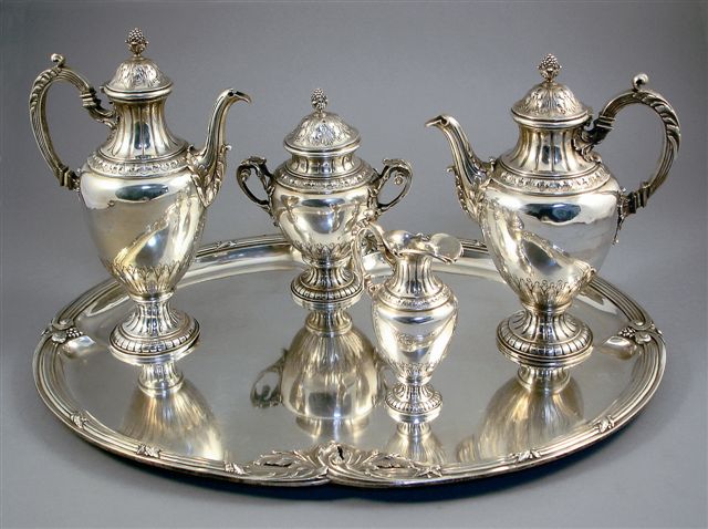 Il comprend une cafetière, une théière, un sucrier, un pot à lait et un plateau de service.