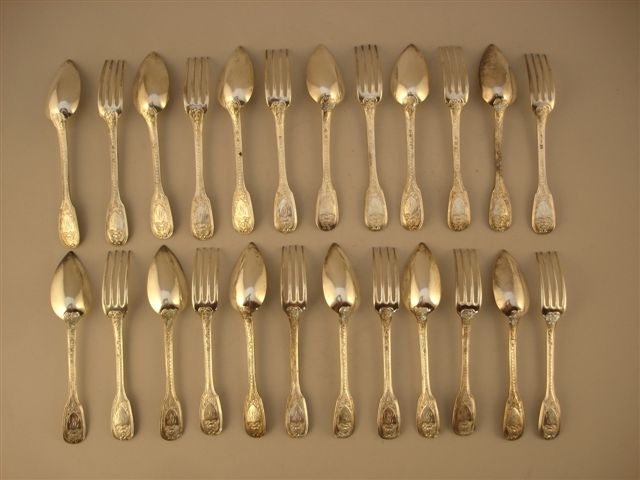 DOUZE COUVERTS À ENTREMETS en argent. Modèle filets. Riche répertoire de la Restauration: cornes d'abondances, pampres, panier fleuri, feuilles de laurier. Poinçon Vieillard (Paris, 1819-1838).