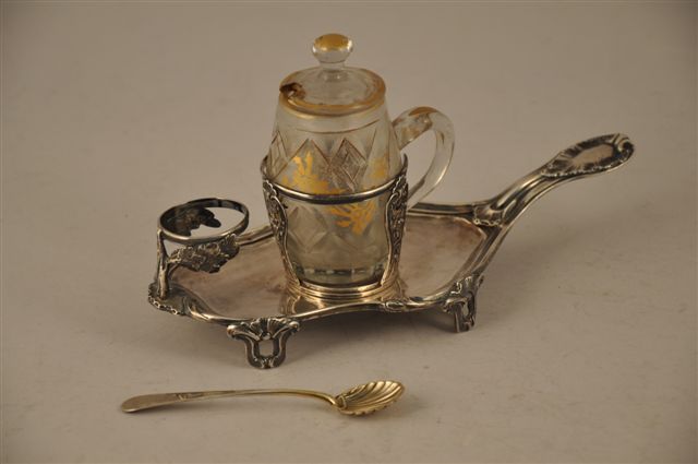 MOUTARDIER argent. Plateau de forme mouvementée à moulures de filets, feuilles d'acanthe, coquille. Il repose sur quatre pieds agrafés de feuilles d'acanthe. Manche à branche ornée d'une coquille en relief prolongée sur la spatule par une large coquille rocaille. Porte couvercle à décor de feuillages. Réceptacle ajouré d'appliques aux pampres.