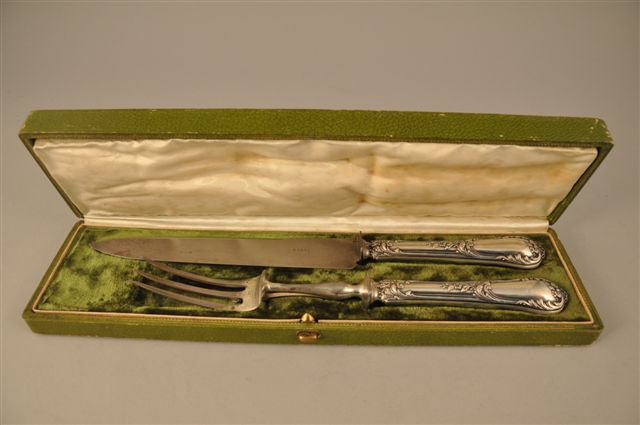 FOURCHETTE et COUTEAU À DÉCOUPER en argent fourré, modèle à coquille. Ecrin. Poinçon Minerve.