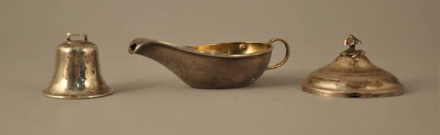 Joint: COUVERCLE en argent à décor en frise de palmettes, prise en fleur épanouie. Travail étranger. Poids: 35 g. Fausse CLOCHE en argent (éteignoir?), perforée. Poids: 15 g.