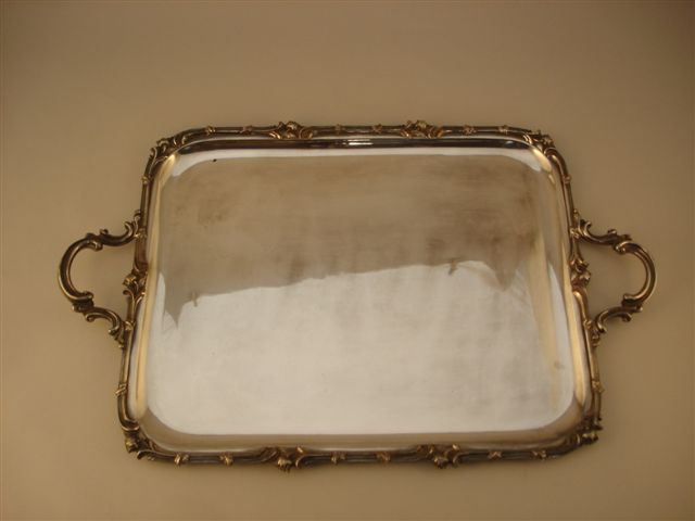 GRAND PLATEAU DE SERVICE de forme rectangulaire en métal argenté. Aile ornée de feuilles d'acanthe et fleurettes. Les anses agrafées de volutes feuillagées. Travail de la Maison Christofle. Style Louis XV. XXème siècle. Long. 70, Larg. 43 cm.