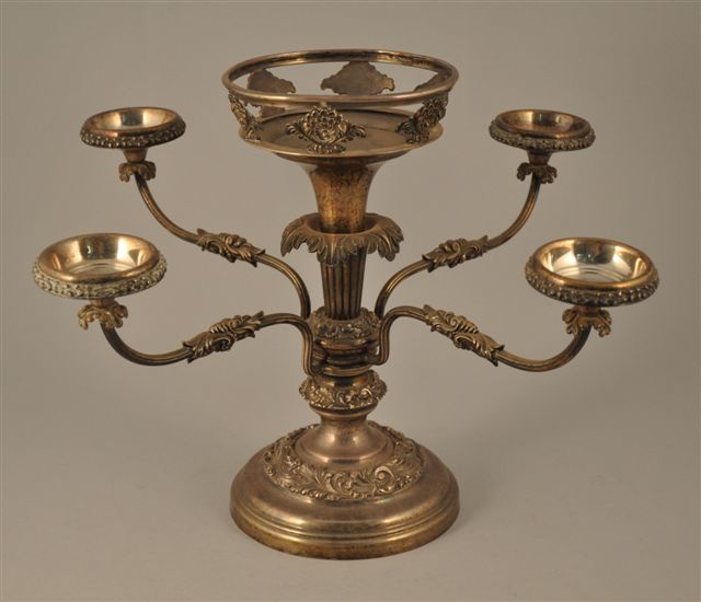 COUPE formant candélabre à quatre lumières en métal argenté. La base circulaire à profil mouluré ornée d'une frise de feuille d'acanthe. Bras godronnées. Fût terminé en panache présentant une monture ajourée de six motifs floraux stylisés.