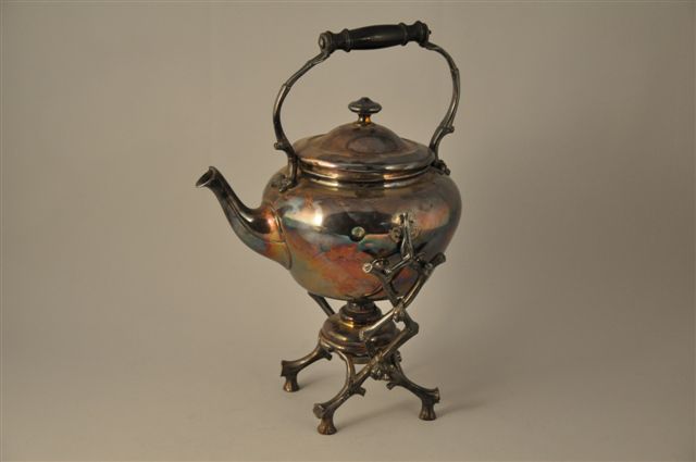 THÈIERE et son RECHAUD en métal argenté, thèire de forme pansu, monogrammé " G ", décor de branches entrelassées pour le réchaud. Christofle. Haut. 41 cm. ( petits chocs sur la panse ).